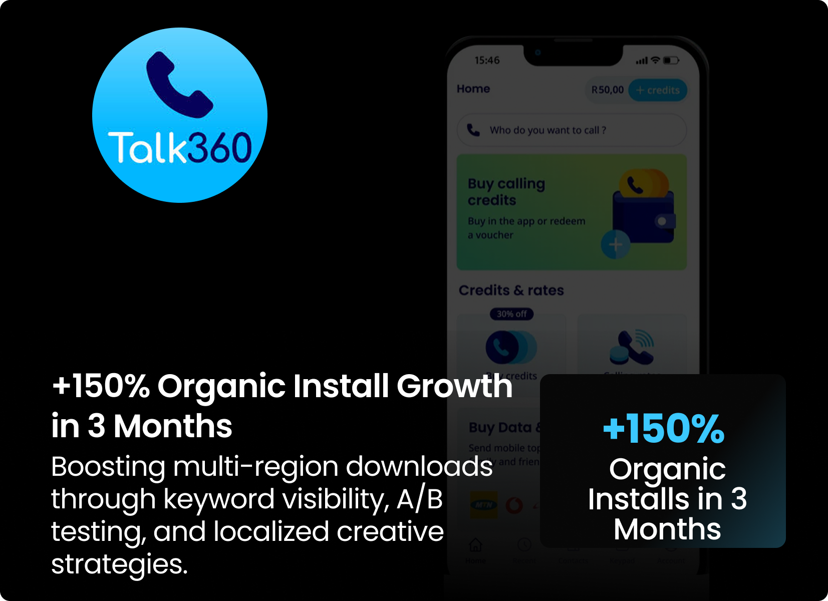 Talk360 wanted to significantly increase organic downloads across multiple regions (US, UK, and South Africa). The main challenge was improving keyword visibility and conversion in a highly competitive communications category.